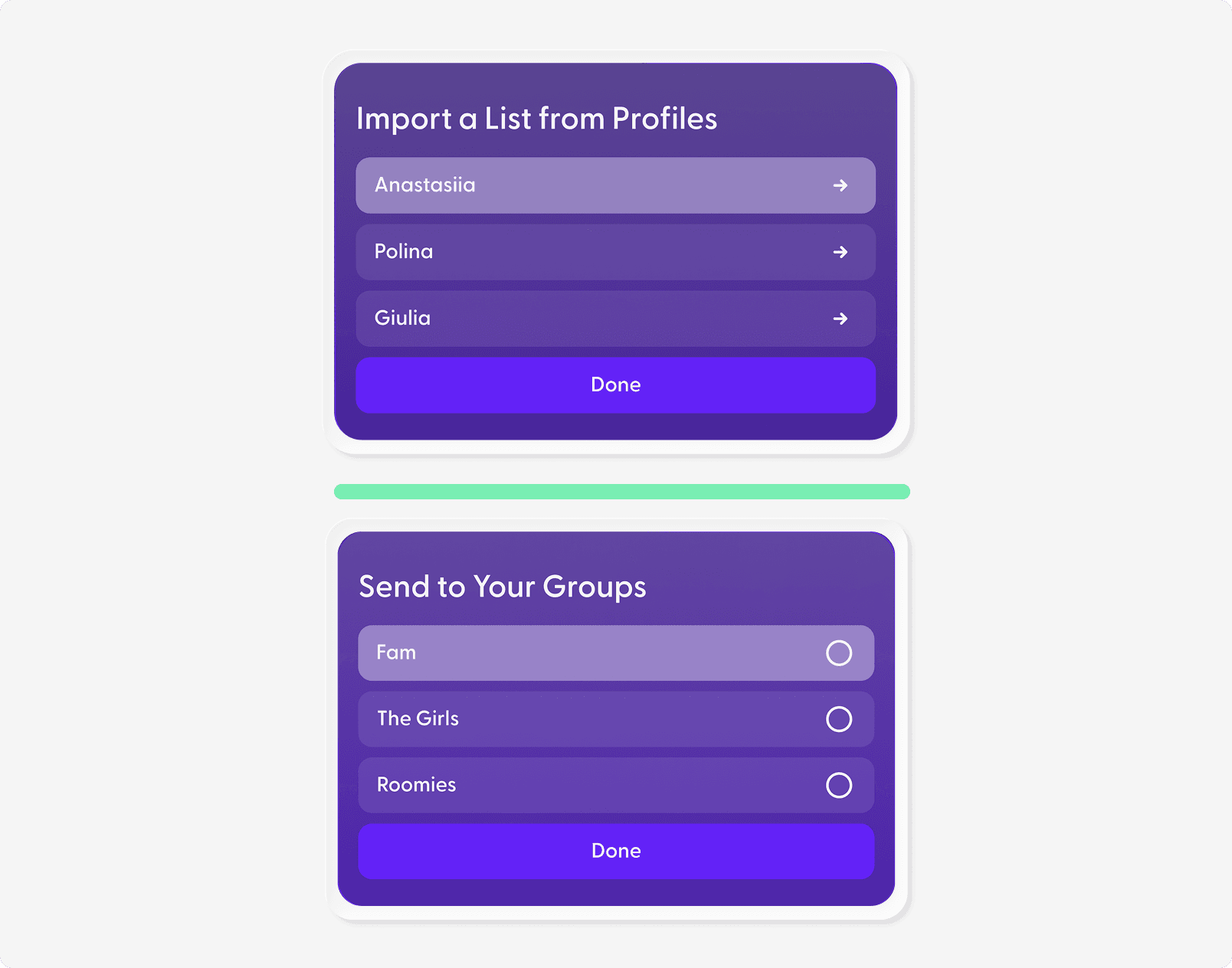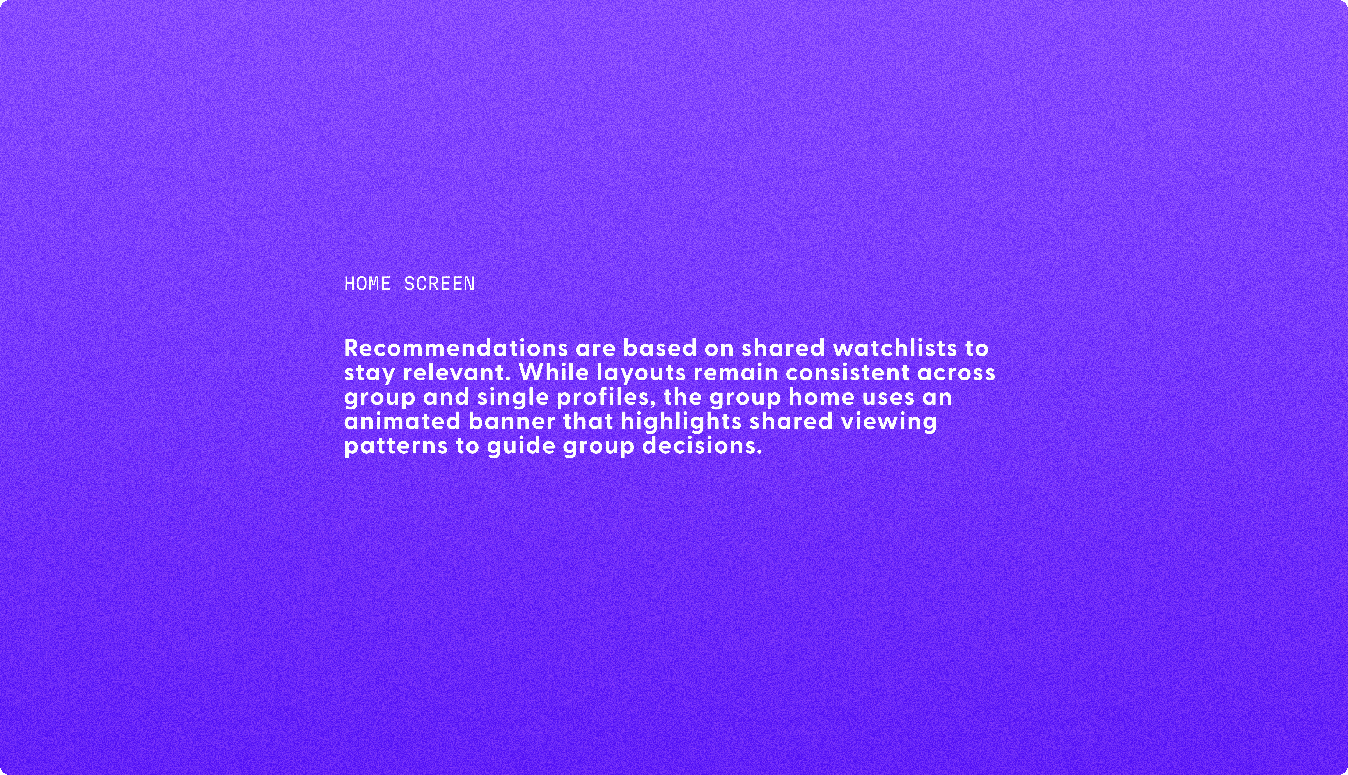 Layouts remain consistent across group and single profiles, the group home uses an animated banner that highlights shared viewing patterns to guide group decisions.